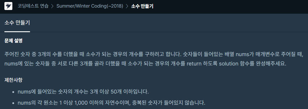 "nums에 있는 숫자들 중 서로 다른 3개를 골라 더했을 때 소수가 되는 경우의 개수"