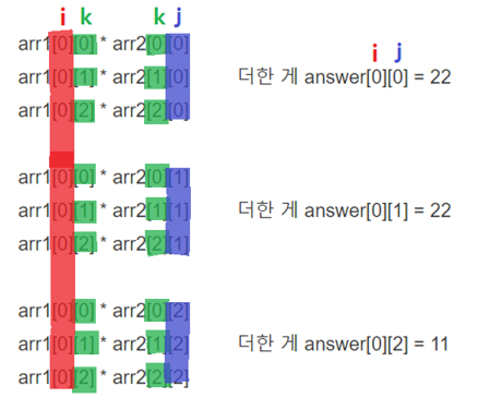 arr1[0][1] * arr2[1][1] 더한 게 answer[0][1] = 22