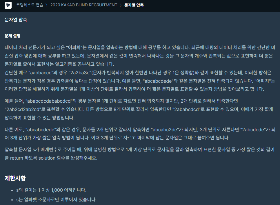 from collections import defaultdict def solution(s): answer = len(s) for i in range(1, len(s) // 2 + 1) : # i : 자를 문자열 개수 li = defaultdict(int) # li : 해당 문자의 연속된 개수 저장하는 딕셔너리 result = "" # result : 압축된 문자열 start = i # start : 현재 문자의 시작 인덱스 stack = [] # stack : 들어오는 문자 저장하는 리스트 (스택) stack.append(s[:start]) # 처음 들어온 문자는 이미 스택에 저장하고 시작 li[s[:start]] += 1 # li 딕셔너리에 해당 문자 개수 +1 while(True) : # 압축하는 ..